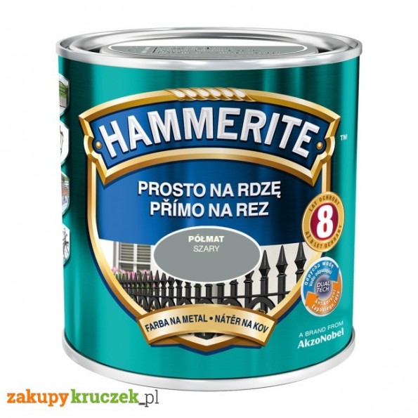 Hammerite Prosto Na Rdzę – efekt półmatowy – to nowoczesna, jednoskładnikowa farba, schnąca na powietrzu, przeznaczona do antykorozyjnego i dekoracyjnego malowania metali żelaznych (stal, żeliwo), zarówno tych pokrytych rdzą, jak i czystych. Może być również stosowana do zabezpieczenia metali nieżelaznych po odpowiednim zagruntowaniu. Wykończenie w efekcie półmatowym zapewnia niepowtarzalne walory estetyczne i długotrwałą ochronę antykorozyjną.